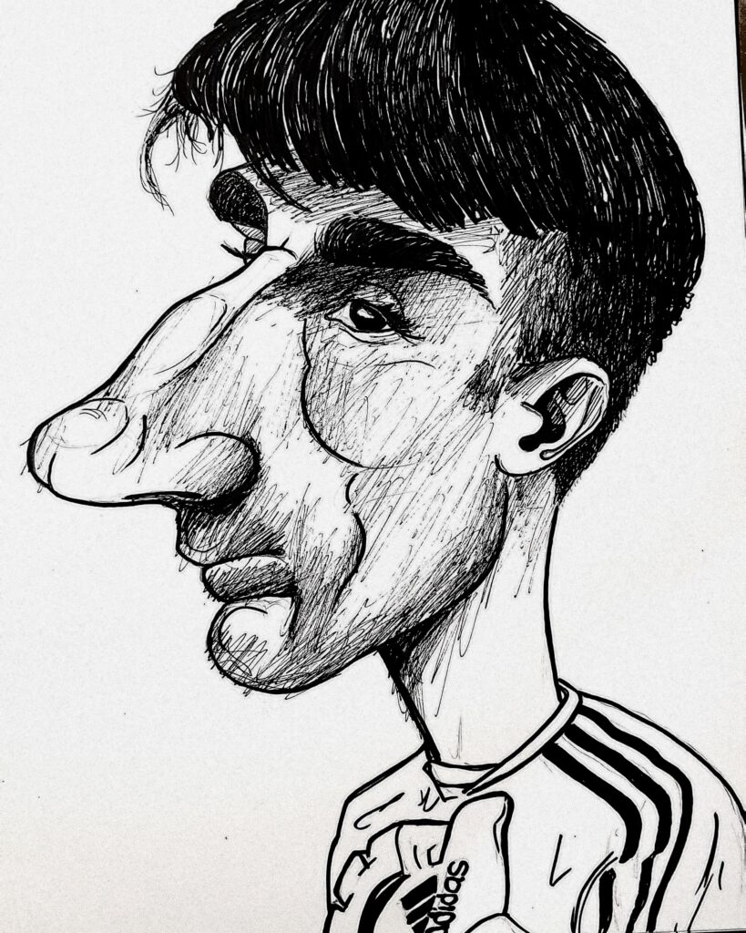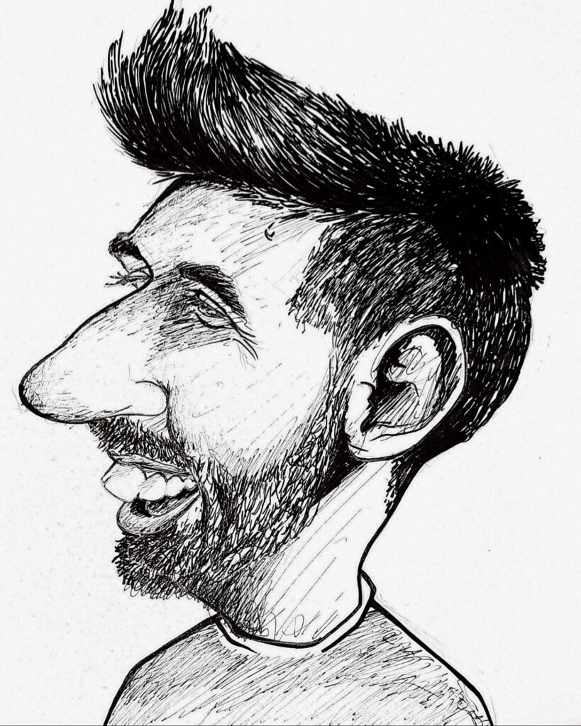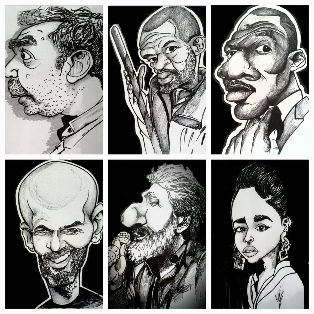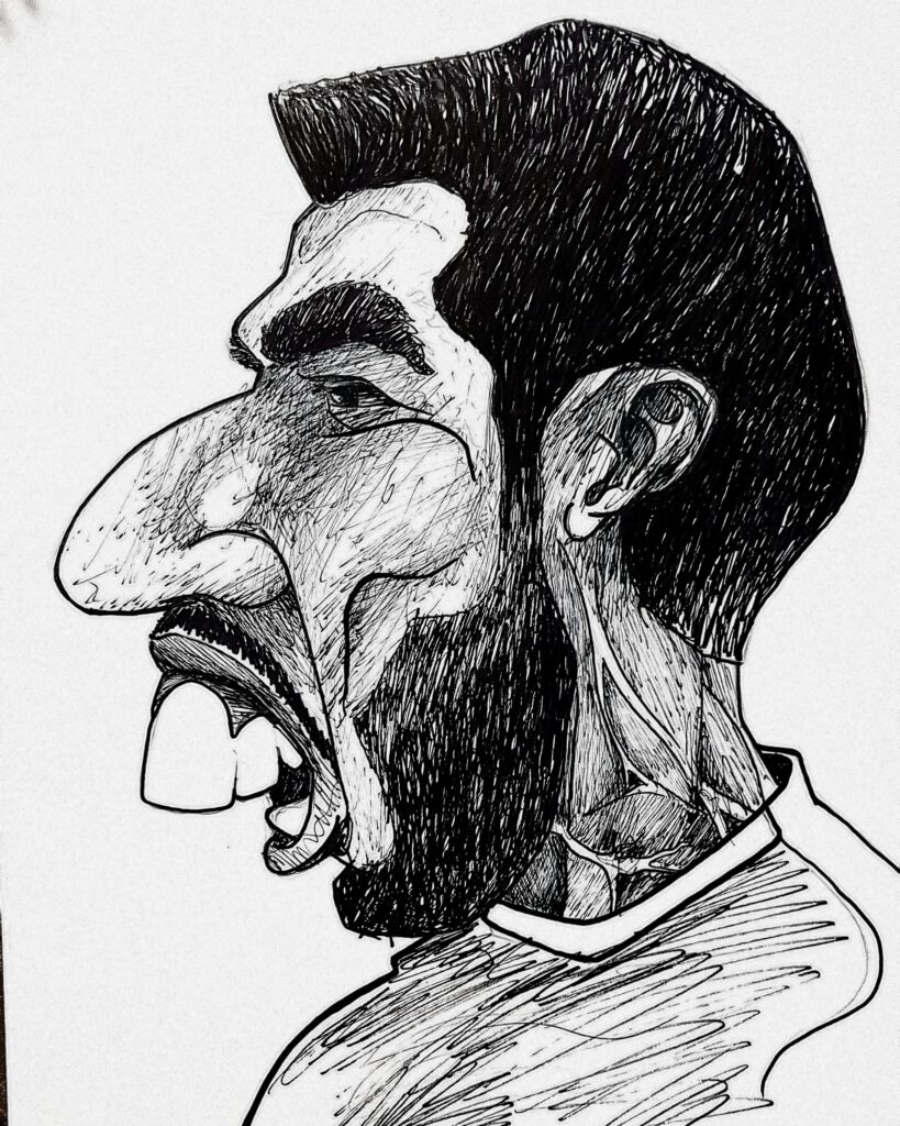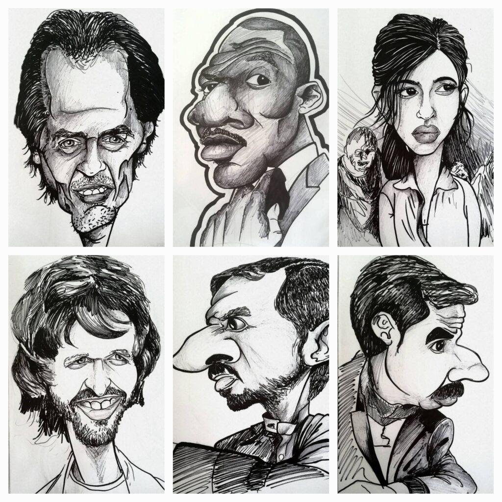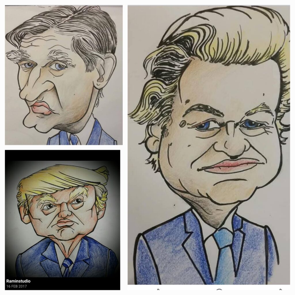 Ramin maakt meer dan alleen kunst uit oude kleding. Zo maakt hij ook karikaturen en muurschilderingen.